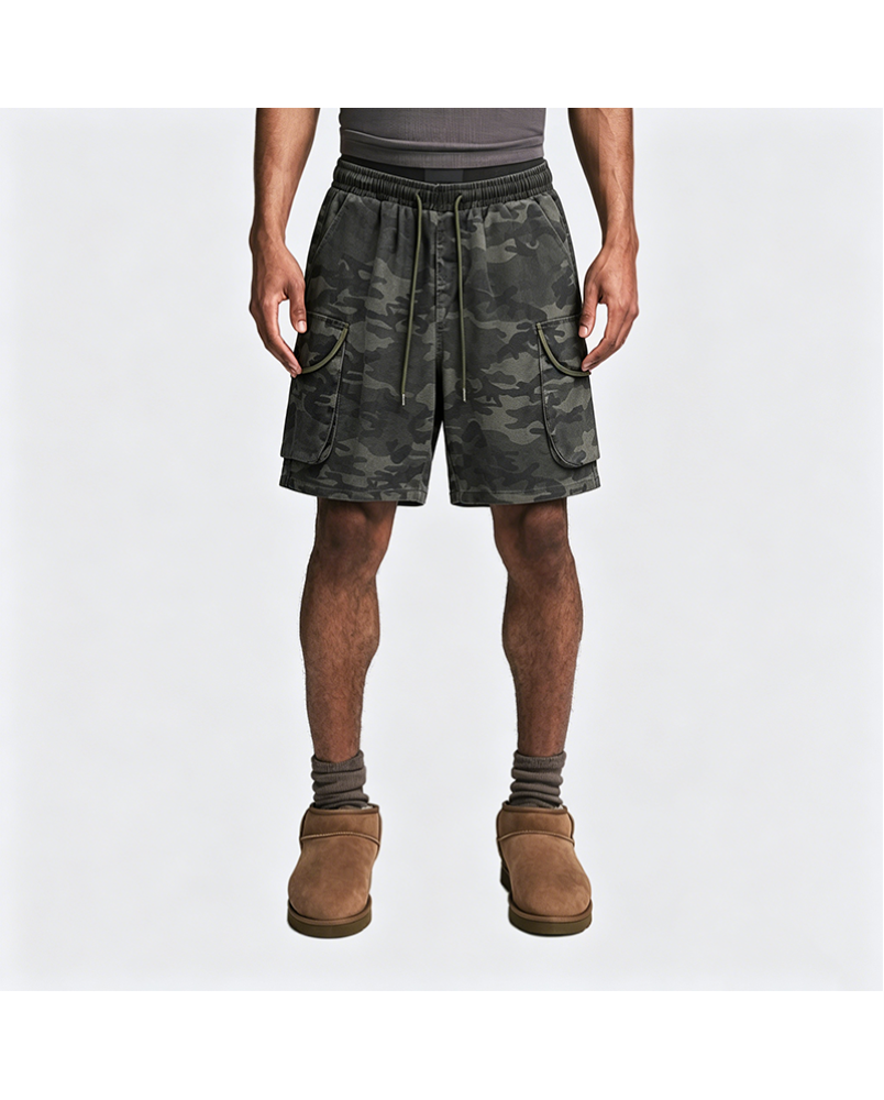 These denim shorts feature a camo pattern and a washing process, showcasing a classic American retro style. The loose straight-leg cut balances casual comfort with streetwear flair.