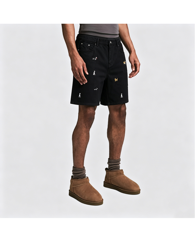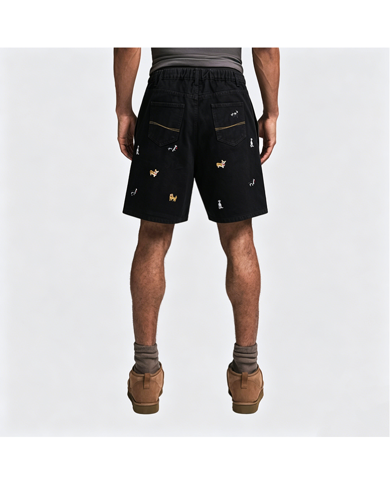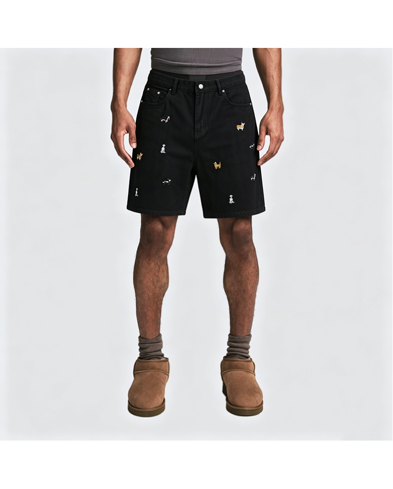 These denim shorts feature an American retro style design, offering a unique and trendy appeal. The playful puppy embroidery on the pants adds lively details to the simple denim fabric.