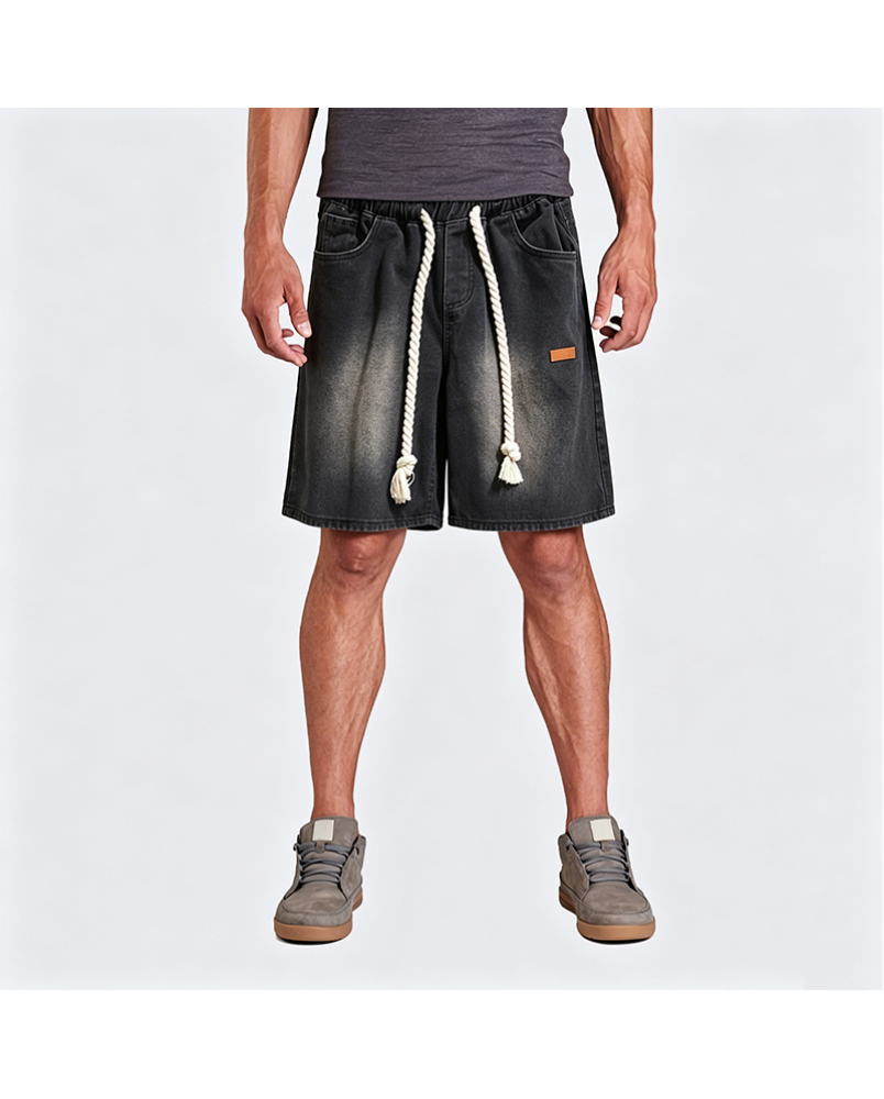 Men's Washed Denim Shorts with Drawstring Waist American Retro Casual