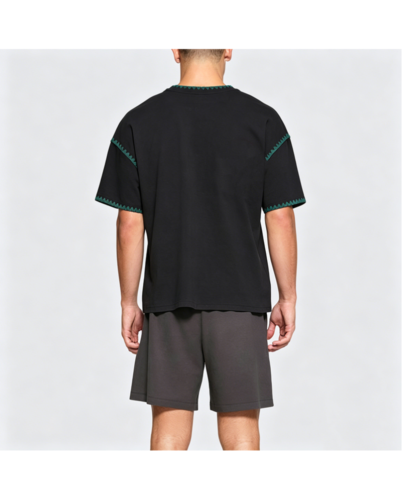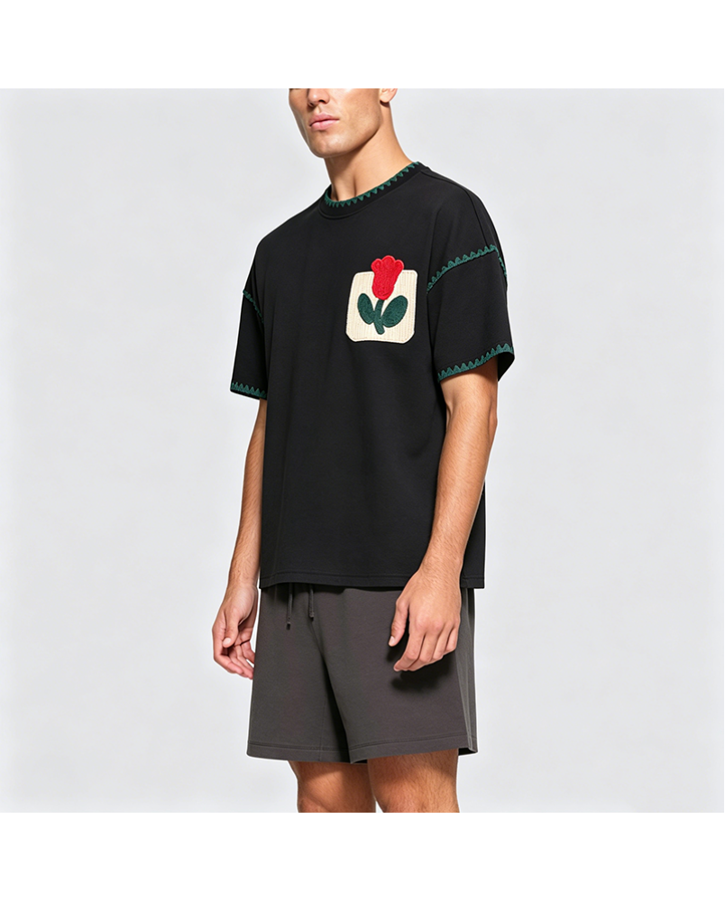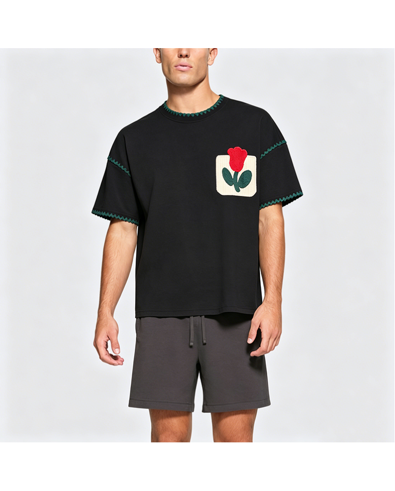 Retro Patchwork Embroidered False Pocket Floral Short-Sleeve T-Shirt