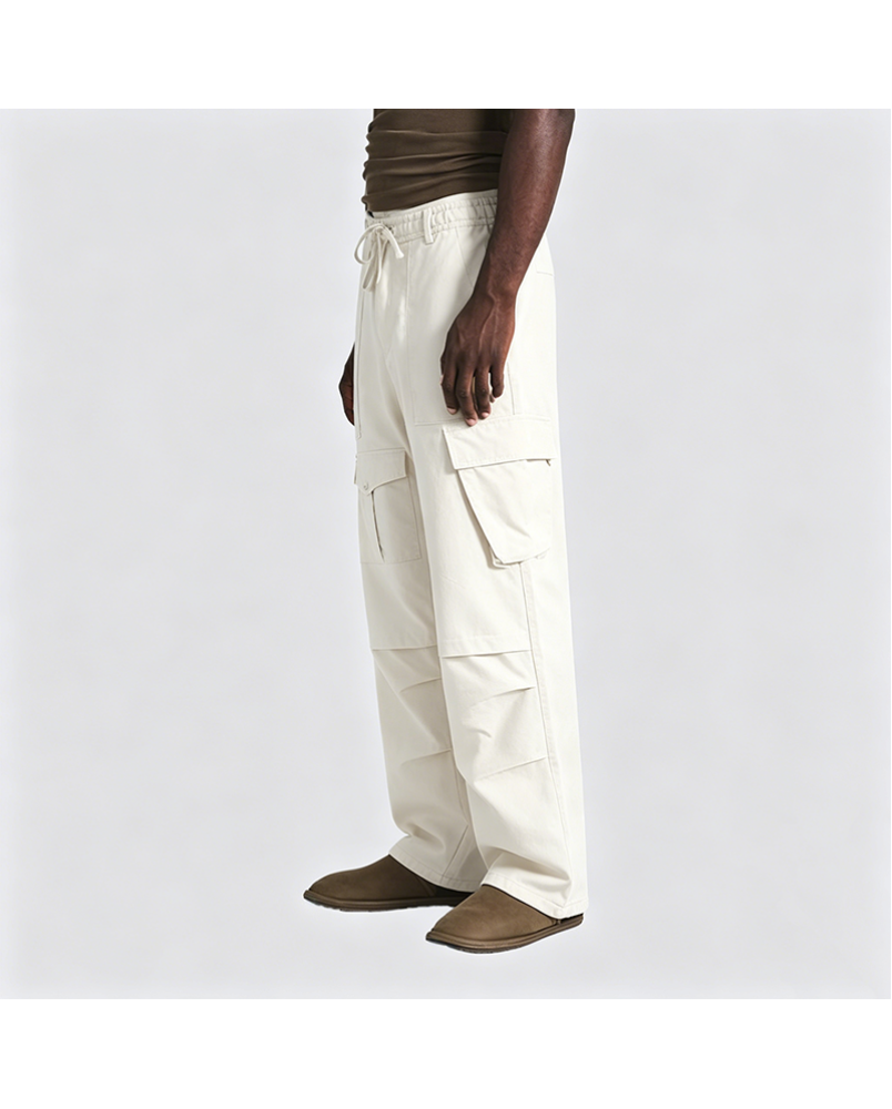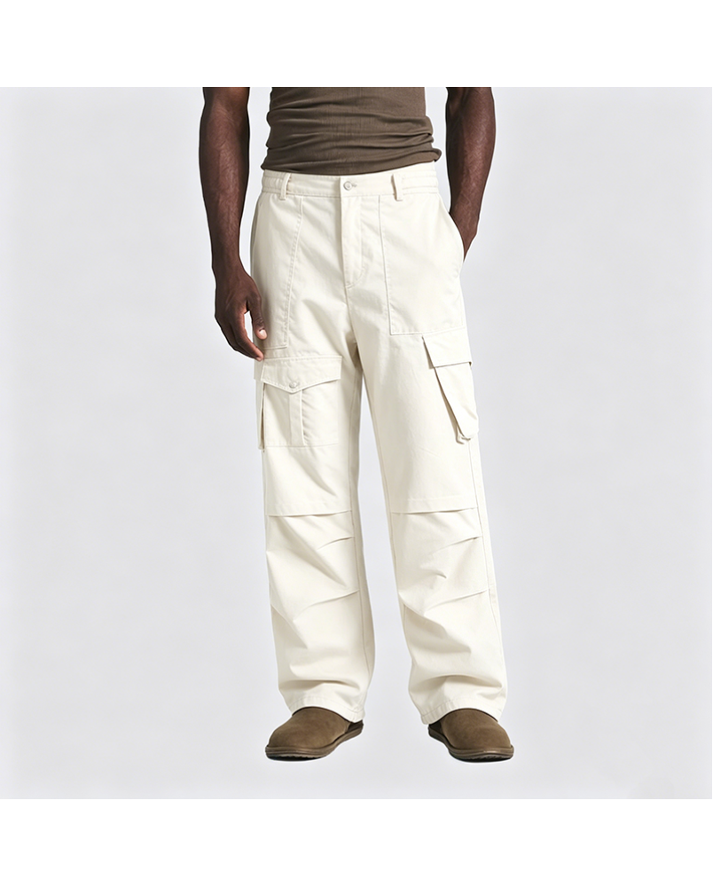 Design Details: Pants incorporate pleated elements and multiple functional pockets.